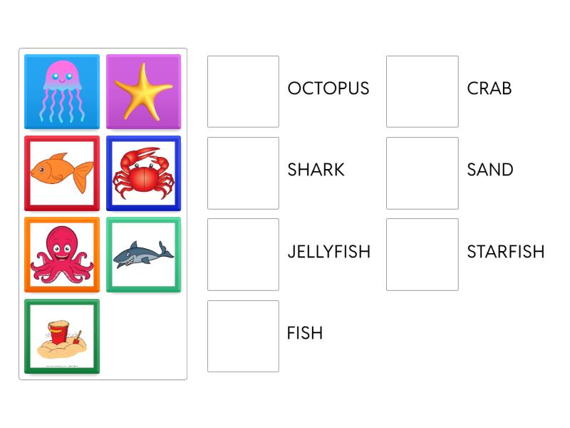 DOLPHIN, JELLYFISH, SEAHORSE, CRAB, STARFISH, OCTOPUS, SAND, FISH, SEASHELL, SHARK, SQUID, TURTLE, CLOWNFISH,