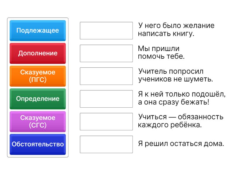 Подлежащее - Учиться — обязанность каждого ребёнка., Сказуемое (ПГС) - Я к ней только подошёл, а она сразу бежать!, Сказуемое (СГС) - Я решил остаться дома., Дополнение - Учитель попросил учеников не шуметь., Обстоятельство - Мы пришли помочь тебе., Определение - У него было желание написать книгу.,