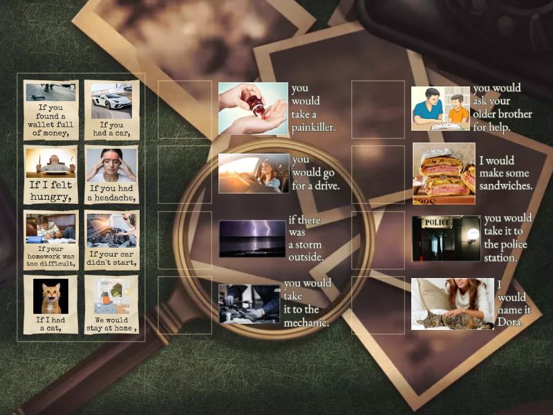 If I had a cat, - I would name it Dora. , You would learn a lot, - if you read newspapers. , If Jess lived near her family, - she wouldn't be lonely. , If we could travel anywhere in the world, - we would go to Bali., If you had a car, - you would go for a drive. , If Kerry had more money, - she would buy a new laptop. , If you had a hobby, - you wouldn't feel bored all the time., Luke would joined us tonight, - if he wasn't sick. , If I felt hungry, - I would make some sandwiches., If you found a wallet full of money, - you would take it to the police station., We would stay at home , - if there was a storm outside. , If your car didn't start, - you would take it to the mechanic. , If your homework was too difficult, - you would ask your older brother for help. , If you saw someone stealing your car, - you would call the police. , If you had a headache, - you would take a painkiller. ,