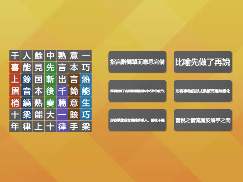 先斬後奏 - 比喻先做了再說, 千篇一律 - 形容事物的形式呆板而毫無變化, 喜上眉梢 - 喜悅之情流露於眉宇之間, 熟能生巧 - 做事熟練了自然能領悟出其中巧妙的竅門。, 言簡意賅 - 指言辭簡單而意思完備, 餘音繞梁 - 形容歌聲或音樂美妙感人,餘味不絕,
