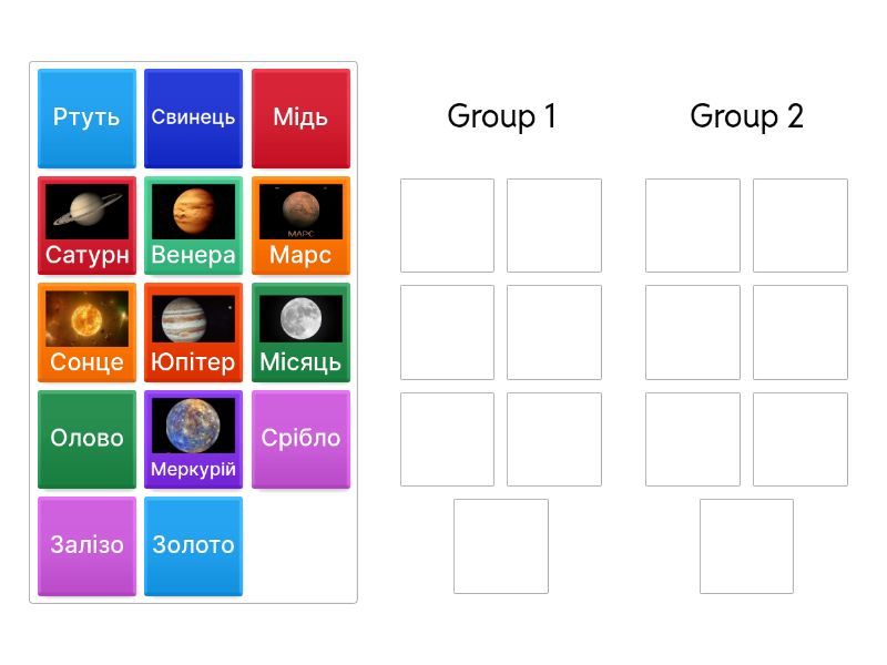 Group 1: Сонце, Місяць, Венера, Марс, Юпітер, Сатурн, Меркурій, Group 2: Золото, Срібло, Мідь, Залізо, Олово, Свинець, Ртуть,
