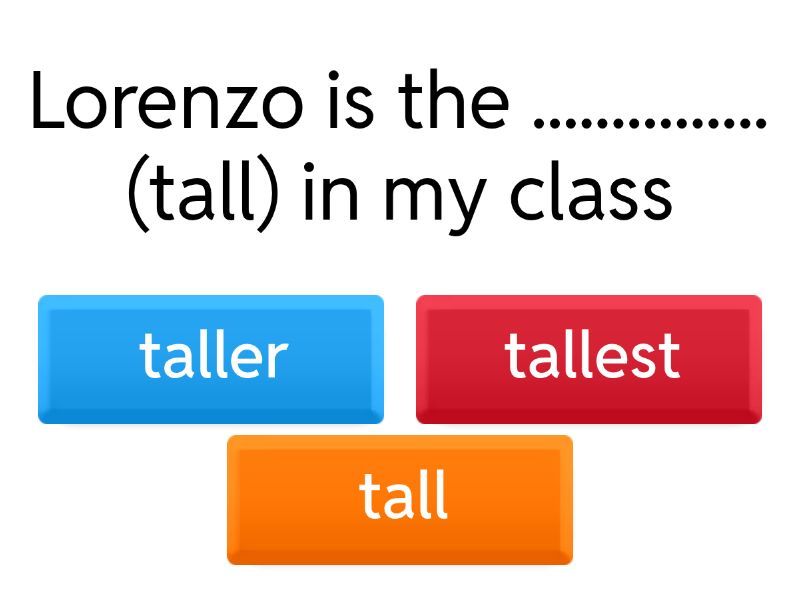 1) Lorenzo is the ............... (tall) in my class a) taller b) tallest c) tall 2) Who is the ................ (famous) footballer in the world? a) most famous b) more famous c) famous 3) Stas is ............ (good) than Nikita at playing volleyball. a) most good b) good c) better 4) Karina is .............. (nice) than Donald a) nicest b) nice c) nicer  5) History is ............ (interesting) than Italian a) more interesting b) interesting c) most interesting 6) Tom is ............. (intelligent) than Jerry a) most intelligent b) more intelligent c) intelligent 7) Moscow is the .............. (big) city in Russia. a) bigger b) big c) biggest 8) Your classroom is ............... (small) than mine. a) smallest b) small c) smaller 9) The Nile is ................... (long) river in the world. a) the longest b) long c) longer than 10) I am ............. (bad) at Maths than my sister. a) worse b) worst c) bad 11) Her bedroom is ...................... ( big) room in my house. a) big b) the biggest c) bigger than 12) Australia is ..................... (small) continent in the world. a) the smallest b) smaller than c) Small 13) Cheetah is ........................( fast) animal on Earth. a) the fastest b) fast c) faster than 14) Mount Everest is ......................( high) mountain on Earth. a) higher than b) high c) the highest 15) Chinese is ........................ (difficult) than Spanish a) more difficult b) difficulter c) the most difficult