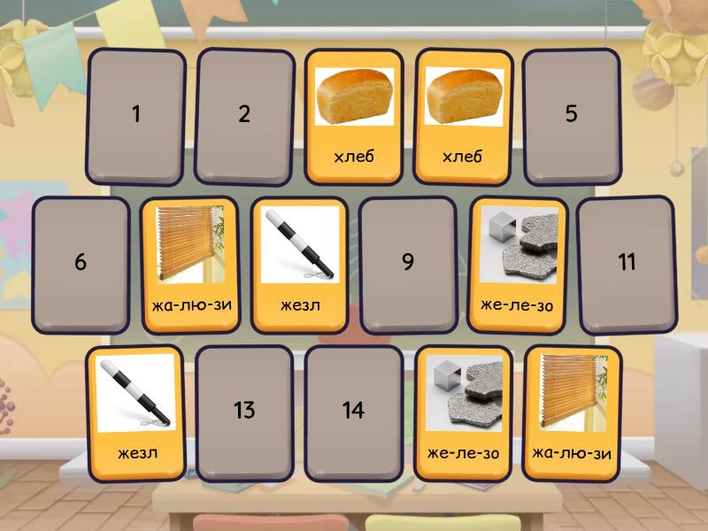 жезл, хлеб, же-ле-зо, жа-лю-зи, за-жи-гал-ка, хо-мяк, ху-дож-ник, хо-ло-диль-ник,