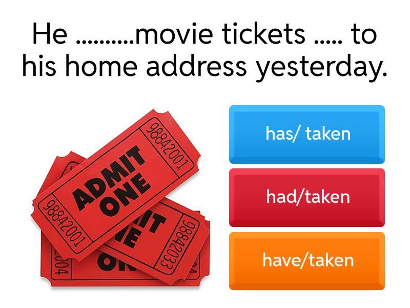 1) He ..........movie tickets ..... to his home address yesterday. a) has/ taken b) had/taken c) have/taken 2) You should .........! You can´t have all your clothes dirty for so long! a) have the washing machine fixed b) had the washing machine fixed c) have the washing machine fix 3) I´m going to ....the lights....by an electrician next Friday. a) got/fixed b) get/fixed c) fix 4) We ......the washing up .....by the maid every day. a) have/done b) had/ done c) have / made 5) I .....my driving license and passport .....while I was at the airport last Monday. a) get/stolen b) have/stolen c) had/stolen 6) I ......... the house ..... if I could afford it. a) would have/redecorated b) would have had/redecorated 7) You should .....your suit.....for the wedding next weekend. a) get/clean b) get/cleaned c) got/cleaned 8) I am going to .....my hair .... tomorrow at the hairdresser´s. a) get/dye b) had/dyed c) have/dyed