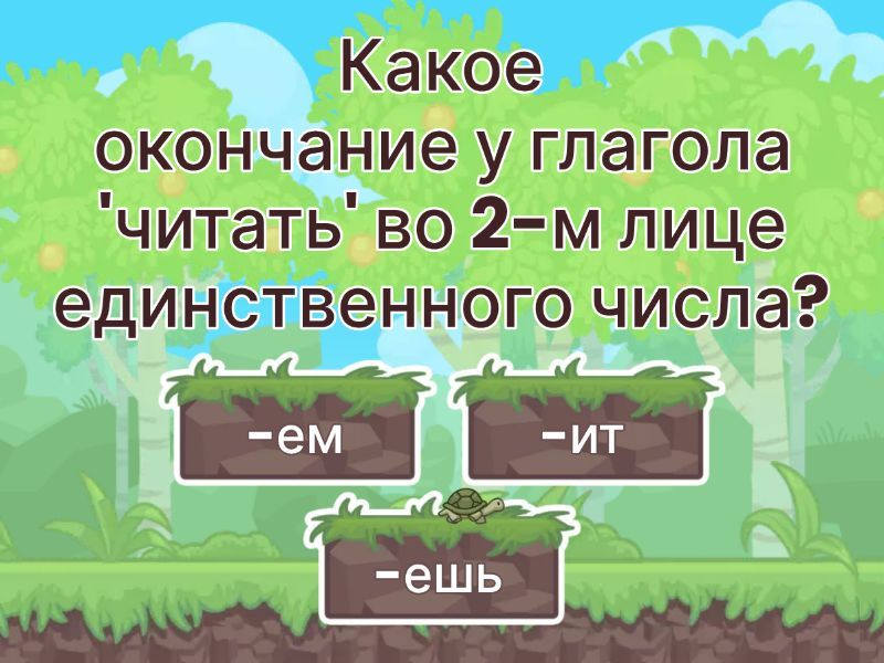 1) Какое окончание у глагола 'читать' во 2-м лице единственного числа? a) -ем b) -ит c) -ешь 2) Какое окончание у глагола 'писать' в 3-м лице множественного числа? a) -ет b) -ют c) -им 3) Какое окончание у глагола 'идти' в 1-м лице множественного числа? a) -ем b) -им c) -ут 4) Какое окончание у глагола 'любить' в 3-м лице единственного числа? a) -ет b) -ит c) -ют 5) Какое окончание у глагола 'работать' в 1-м лице единственного числа? a) -ут b) -им c) -ю 6) Какое окончание у глагола 'играть' во 2-м лице единственного числа? a) -ешь b) -ит c) -ем 7) Какое окончание у глагола 'петь' в 3-м лице множественного числа? a) -им b) -ет c) -ют 8) Какое окончание у глагола 'учить' в 1-м лице множественного числа? a) -им b) -ем c) -ут 9) Какое окончание у глагола 'плавать' во 2-м лице множественного числа? a) -ите b) -ете c) -ят 10) Какое окончание у глагола 'бегать' в 3-м лице единственного числа? a) -ют b) -ит c) -ет 11) Какое окончание у глагола 'рисовать' в 1-м лице единственного числа? a) -им b) -ю c) -ут 12) Какое окончание у глагола 'прыгать' во 2-м лице единственного числа? a) -ешь b) -ит c) -ем 13) Какое окончание у глагола 'танцевать' в 3-м лице множественного числа? a) -им b) -ет c) -ют 14) Какое окончание у глагола 'читать' в 1-м лице множественного числа? a) -ут b) -им c) -ем 15) Какое окончание у глагола 'писать' во 2-м лице множественного числа? a) -ете b) -ите c) -ят 16) Какое окончание у глагола 'идти' в 3-м лице единственного числа? a) -ит b) -ет c) -ют 17) Какое окончание у глагола 'жить' в 1-м лице единственного числа? a) -ут b) -им c) -ю 18) Какое окончание у глагола 'любить' во 2-м лице единственного числа? a) -ем b) -ит c) -ишь