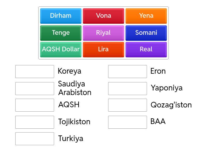 Dirham - BAA, Vona - Koreya, Manat - Ozarboyjon, Yuan - Xitoy, Som - O'zbekiston, Rupiy - Hindiston, AQSH Dollar - AQSH, Real - Eron, Rubl - Rossiya, Yena - Yaponiya, Funt - Buyuk Britaniya , Lira - Turkiya, Tenge - Qozag'iston, Dinor - Iroq, Somani - Tojikiston, Frank - Shvetsariya, Riyal - Saudiya Arabiston, Griven - Ukraina,
