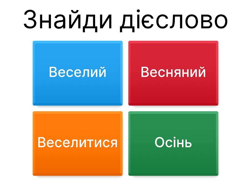 1) Знайди дієслово a) Веселий b) Весняний c) Веселитися d) Осінь 2) Знайди дієслово a) Журитися b) Хороший c) Бджола d) Хуртовина 3) Знайди рядок з дієсловами a) Грати,співак,танці b) Грати, співати, танцювати c) Іграшка,спів, танцювати 4) Знайди рядок з дієсловами a) Бачу,іду,співак b) Шукаю,позичу,ложа c) Побачу,палає,бережу 5) Знайди дієслово a) Біг b) Бігти c) Білий