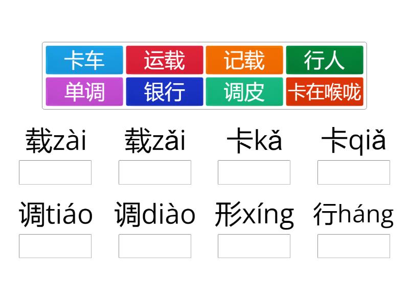 载zài: 运载, 载zǎi: 记载, 卡kǎ: 卡车, 卡qiǎ: 卡在喉咙, 调tiáo: 调皮, 调diào: 单调, 形xíng: 行人, 行háng: 银行,