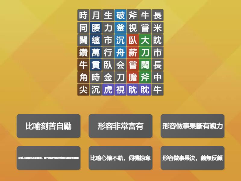 大刀闊斧 - 形容做事果斷有魄力, 虎視眈眈 - 比喻心懷不軌,伺機掠奪, 臥薪嘗膽 - 比喻刻苦自勵, 破釜沉舟 - 形容做事果決,義無反顧, 鑽牛角尖 - 比喻人固執而不知變通,費力的研究無用或無法解決的問題, 腰纏萬貫 - 形容非常富有,