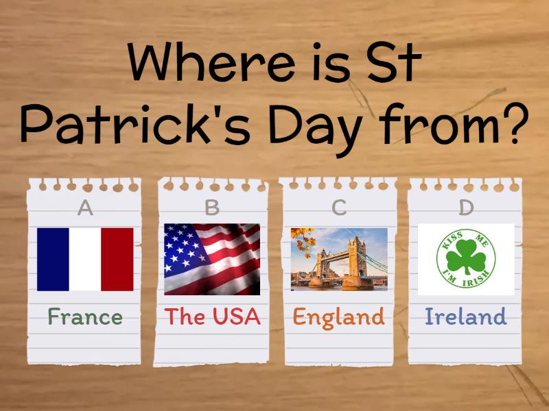 1) Where is St Patrick's Day from? a) France b) The USA c) England d) Ireland 2) Where was Patrick from? a) Germany b) Portugal c) Wales d) Italy 3) When is it celebrated? a) on March 17th b) on March 18th c) on April 1st d) on December 25th 4) What was Patrick's religion? a) He was Jewish b) He was Christian c) He was an atheist d) He was Buddhist 5) What is the most common plant that grows in Ireland? a) Daisies b) Roses c) Shamrocks d) Tulips 6) How does St. Patrick use the shamrock? a) to ask for money b) to find gold c) to explain about leprechauns d) to explain about the Trinity 7) What animal can't you find in Ireland? a) dogs b) cats c) snakes d) birds