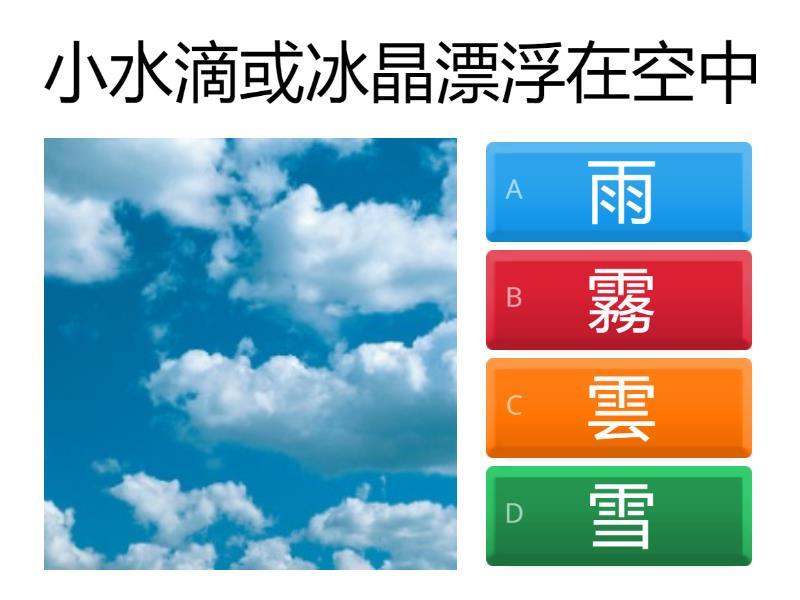 1) 小水滴或冰晶漂浮在空中 a) 雨 b) 霧 c) 雲 d) 雪 2) 小水滴或冰晶漂浮在地面附近 a) 雨 b) 雪 c) 霜 d) 霧 3) 小水滴或冰晶聚集而變大變重,以水的型態落到地面 a) 雪 b) 雨 c) 霧 d) 雲 4) 大冰晶落到地面仍未融化 a) 霧 b) 雨 c) 雲 d) 雪 5) 地面附近的水蒸氣附著在溫度低的物體上 a) 露 b) 雪 c) 霧 d) 雲 6) 地表溫度低於攝氏零度,水蒸氣附著在物體上 a) 雨 b) 霧 c) 露 d) 霜