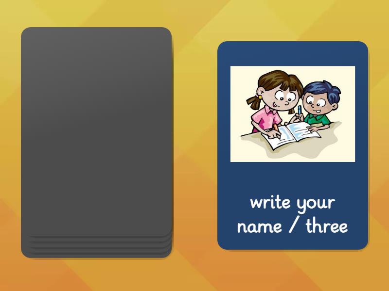 swim / four, count to ten in English / seven, write your name / three, talk / two, walk / one, ride a bike / six.