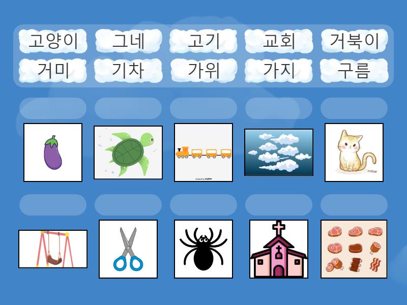 고기, 가위, 거미, 거북이, 가지, 고양이, 교회, 구름, 그네, 기차,