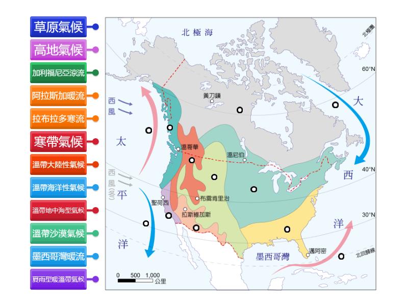 溫帶海洋性氣候, 溫帶地中海型氣候, 阿拉斯加暖流, 加利福尼亞涼流, 高地氣候, 草原氣候, 溫帶沙漠氣候, 溫帶大陸性氣候, 夏雨型暖溫帶氣候, 墨西哥灣暖流, 寒帶氣候, 拉布拉多寒流.