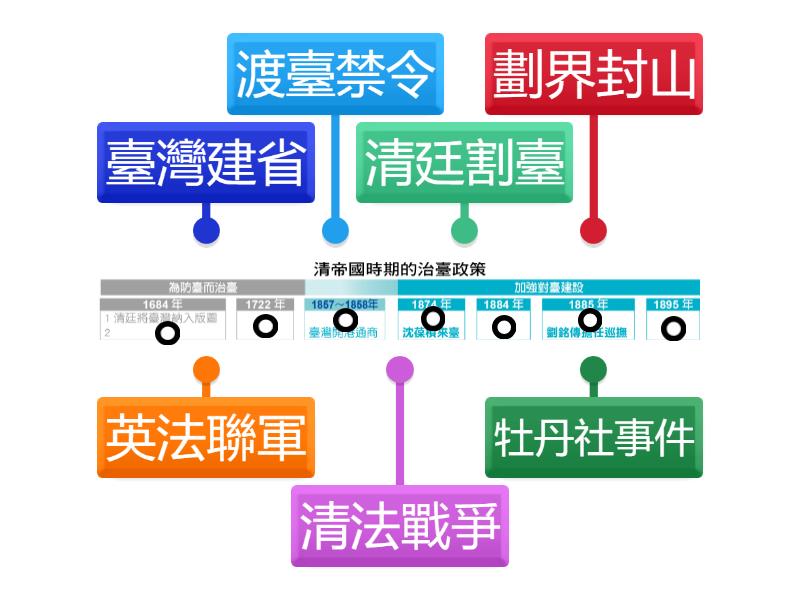 渡臺禁令, 劃界封山, 英法聯軍, 牡丹社事件, 清法戰爭, 臺灣建省, 清廷割臺.