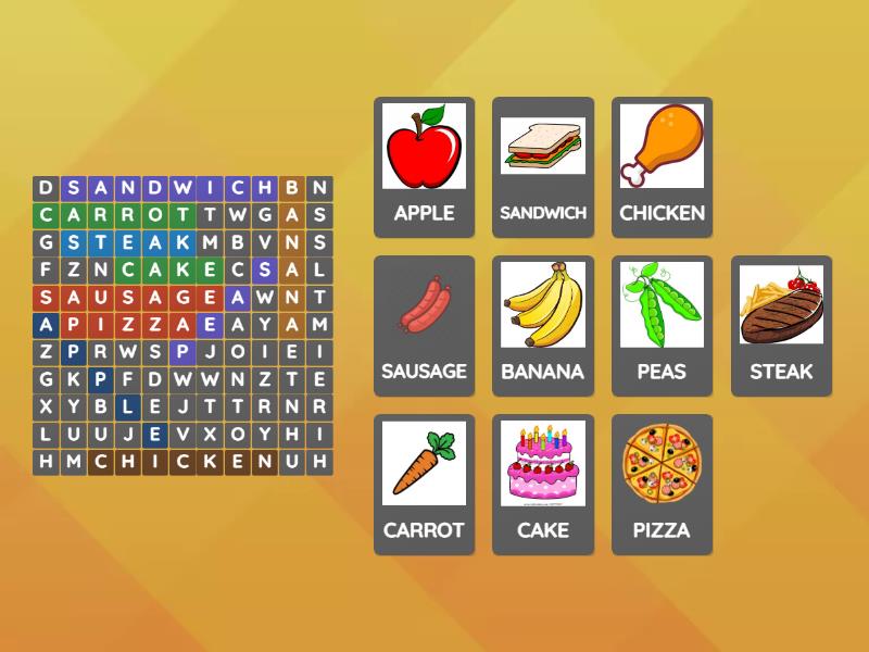 CARROT - CARROT, PEAS - PEAS, PIZZA - PIZZA, STEAK - STEAK, CHICKEN - CHICKEN, APPLE - APPLE, BANANA - BANANA, CAKE - CAKE, SANDWICH - SANDWICH, SAUSAGE - SAUSAGE,