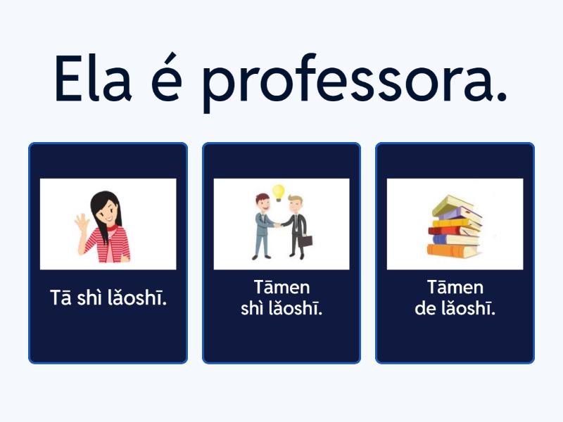 1) Ela é professora.  a) Tā shì lǎoshī. b) Tāmen shì lǎoshī. c) Tāmen de lǎoshī. 2) Ele é estudante. a) (她) Tā shì xuéshēng. b) 他 (tā) Tā shì xuéshēng. c) (它) Tā shì xuéshēng. 3) Você é chinesa? a) Tāmen shì zhōngguó rén ma? b) Nǐmen shì zhōngguó rén ma? c) Nǐ shì zhōngguó rén ma?  4) Ele é um cachorro. a) (它) Tā shì yī zhǐ gǒu. b) (她们)Tāmen shì yī zhǐ gǒu. c) (她)Tā shì yī zhǐ gǒu. 5) Elas são brasileiras.  a) Tāmen láizì bāxī. b) Tāmen shì bāxī rén. c) Tā shì bāxīrén. 6) Nós estudamos mandarim. a) Wǒ xuéxí zhōngwén. b) Wǒmen xuéxí zhōngwén. c) Tā xuéxí zhōngwén. 7) O que vocês estudam? a) Tā xuéxí shénme? b) Nǐ xuéxí shénme? c) Nǐmen xuéxí shénme? 8) Eles estão no trabalho. a) Tāmen zài gōngzuò. b) Tāmen zài gōngzuò. c) Tā zài gōngzuò. 9) Ela é muito bonita.  a) (他们) Tāmen hěn hǎokàn. b) (它)Tā hěn hǎokàn. c) (她们) Tāmen hěn hǎokàn. 10) Elas gostam de compras. a) (她们) Tāmen xǐhuān gòuwù. b) (他们)Tāmen xǐhuān gòuwù. c) (它们)Tāmen hěn guì.