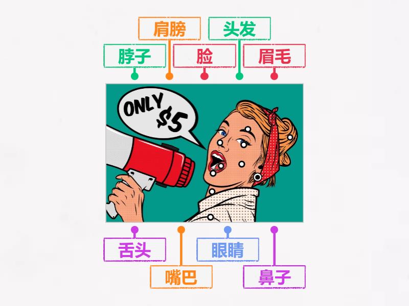 脸, 头发, 嘴巴, 舌头, 眼睛, 眉毛, 脖子, 肩膀, 鼻子.