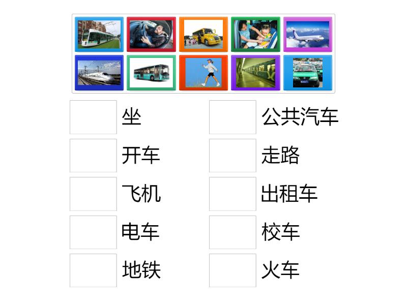 开车, 走路, 坐, 校车, 火车, 电车, 飞机, 地铁, 出租车, 公共汽车,