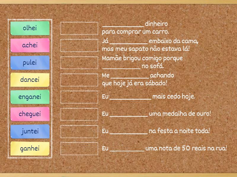 cheguei - Eu ____________ mais cedo hoje., ganhei - Eu ___________ uma medalha de ouro!, dancei - Eu ___________ na festa a noite toda!, juntei - ____________ dinheiro para comprar um carro., olhei - Já ___________ embaixo da cama, mas meu sapato não estava lá!, achei - Eu __________ uma nota de 50 reais na rua!, pulei - Mamãe brigou comigo porque ___________ no sofá., enganei - Me ___________ achando que hoje já era sábado!,