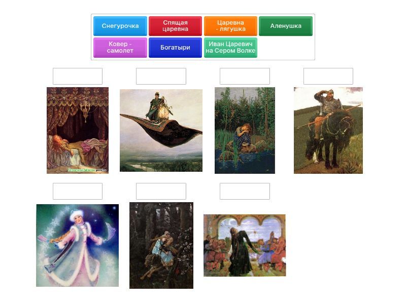 Иван Царевич на Сером Волке, Аленушка, Царевна - лягушка, Снегурочка, Спящая царевна, Богатыри, Ковер - самолет,