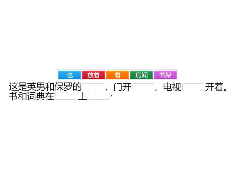 这是英男和保罗的____,门开____,电视____开着。 书和词典在____上____, 保罗在____上____,英男在床上____, 他们____紧张____看电视____的____。 这是一____超级____。 漂漂亮亮____大厅里____一排一排的____, 货架上____地____着____吃的和用的____。 门口____一个____的牌子, 上边____“请勿____”。 这是小雨的家。书房____很____, 爸爸正在____上坐____看报, 妈妈在客厅里跟____ ____咖啡____, 小雨在自己的房间____ 听____音乐看书。 他们家的小猫____? 在____上____睡觉呢。