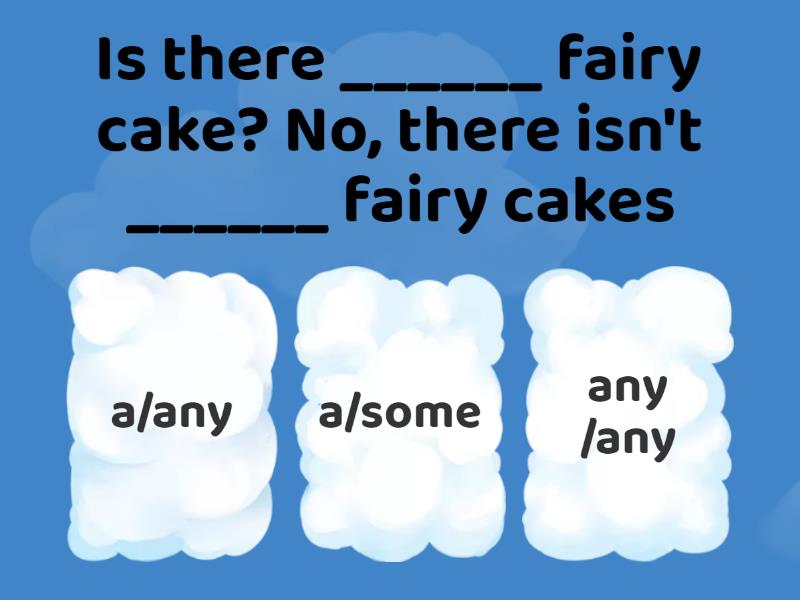 1) Are there ____ carrots in the fridge? No, there are _____ carrots a) any/some b) some/no c) any/no 2) Can I have_____ milk, please? a) some b) any c) no 3) Are there _____ girls in the room? Yes, there are ______ a) some/some b) any/some c) any/no 4) Is there _____ apple in the bag? a) a b) some c) an 5) Is there ______cheese in fridge? No, there is _____ cheese a) any/no b) a/no c) any/some 6) Can I have ________water please? a) a b) some c) any 7) Are there _____ chairs in the room? Yes. There is _____ chair a) any/no b) any/some c) any/a 8) Is there ______ fairy cake? No, there isn't ______ fairy cakes a) a/any b) a/some c) any /any