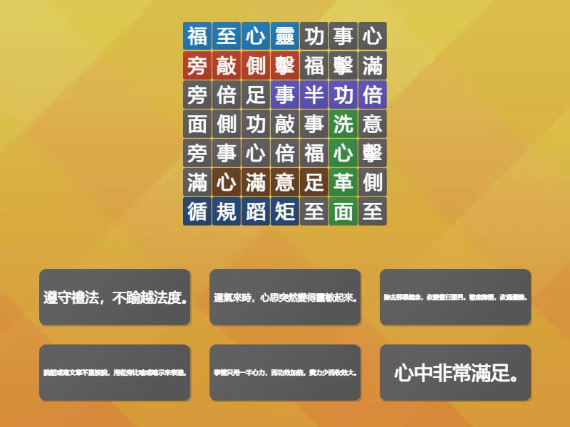 洗心革面 - 除去邪思雜念,改變舊日面目。徹底悔悟,改過遷善。, 事半功倍 - 事情只用一半心力,而功效加倍。費力少而收效大。, 旁敲側擊 - 說話或寫文章不直接說,用從旁比喻或暗示來表達。, 福至心靈 - 運氣來時,心思突然變得靈敏起來。, 心滿意足 - 心中非常滿足。, 循規蹈矩 - 遵守禮法,不踰越法度。,