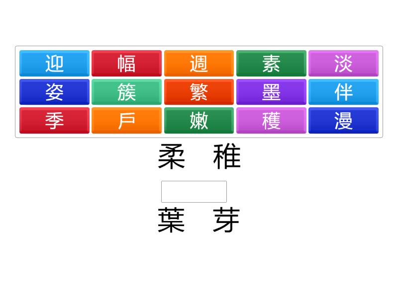 柔 稚 ____ 葉 芽 歡 恭 ____ 接 娶 四 雨 ____ 節 風 窗 客 ____ 籍 口 錦 接 ____ 擁 集 頻 紛 ____ 華 忙 樸 茹 ____ 淨 食 舞 英 ____ 勢 色 相 陪 ____ 奏 舞 磨 筆 ____ 水 綠 浪 散 ____ 畫 步 幾 抓 ____ 末 刊 平 清 ____ 雅 忘 一 篇 ____ 度 射