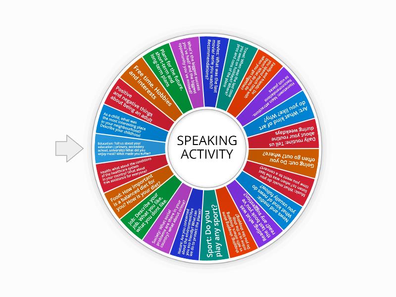1) As a child, what was the most interesting place in your neighbourhood? Describe your childhood 2) Positive and negative things about being an adult 3) Free time. Hobbies and interests 4) Plans for the future. short-term and long-term plans 5) What´s the biggest success you´ve had? and the biggest opportunity you´ve missed? 6) Movies: What was the last movie/ serie you watch? Recommendations? 7) Travel: When was the last time you went on holidays? Where? pros and cons of the place 8) Family and friends: Do you spend much time with them? What do you do when you get together? 9) Hometown: Main attractions. Recommendations to visit places 10) Art: What kind of art do you like? Why? 11) Daily routine: Tell us about your routine during weekdays 12) Going out: Do you often go out? where? 13) Music: What music do you listen to? when was the last time you went to a concert? 14) News and media: What kind of news do you usually follow? 15) Reading: what was the last book you´ve read? any suggestion? 16) shopping: shopping alone vs with others. shopping online vs in the shop. Do you like shopping? 17) Sport: Do you play any sport? 18) Nature: Are you concerned about the environment?Are you eco friendly? What can we do to protect the planet? 19) Society: What social problems are there in your country? what about crime? 20) Job: Describe your job. What you like, what you dont like. 21) Food: How important is a balanced diet for you? How is your diet? 22) Health: what about the conditions of the healthcare system in your country? What about free assistance for everyone? 23) Education: Tell us about your education ( primary, secondary school, university) What did you enjoy most? What made you suffer?