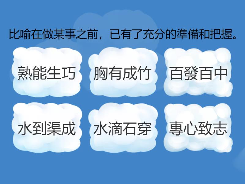 1) 比喻在做某事之前,已有了充分的準備和把握。 a) 熟能生巧 b) 胸有成竹 c) 百發百中 d) 水到渠成 e) 水滴石穿 f) 專心致志 2) 指用心專一,注意力不分散。 a) 龍馬精神 b) 胸有成竹 c) 熟能生巧 d) 馬到成功 e) 水到渠成 f) 專心致志 3) 形容屋子里的人同時都大笑起來。 a) 笑裡藏刀 b) 笑容滿面 c) 胸有成竹 d) 栩栩如生 e) 哄堂大笑 f) 笑傲江湖 4) 比喻兩件事情同時進行。 a) 雙管齊下 b) 一石二鳥 c) 一箭雙鵰 d) 三心二意 e) 一心二用 f) 手腳並用 5) 形容文學、藝術作品對人和其他生物的形象,表現得非常逼真,好像活的一樣。 a) 真假難辨 b) 借屍還魂 c) 生死有命 d) 栩栩如生 e) 生動逼真 f) 生離死別 6) 指做事情熟練了,就會掌握竅門。 a) 熟能生巧 b) 班門弄斧 c) 眾志成城 d) 如假包換 e) 專心致志 f) 滴水穿石 7) 形容射箭或射擊技術非常高明。 a) 一石二鳥 b) 如假包換 c) 百發百中 d) 雕蟲小技 e) 班門弄斧 f) 水到渠成 8) 指極其稀有的珍貴物品。 a) 金玉其外 b) 熟能生巧 c) 山珍海味 d) 如假包換 e) 錦衣玉食 f) 無價之寶 9) 比喻作文或講話時,加上一兩句關鍵的話會使內容更精辟有力。 a) 百發百中 b) 錦上添花 c) 雪中送炭 d) 眾志成城 e) 畫龍點睛 f) 專心致志 10) 比喻雖然力量小,只要堅持做下去,就能做出很難辦到的事來。 a) 專心致志 b) 一心一意 c) 水滴石穿 d) 以小博大 e) 眾志成城 f) 積少成多