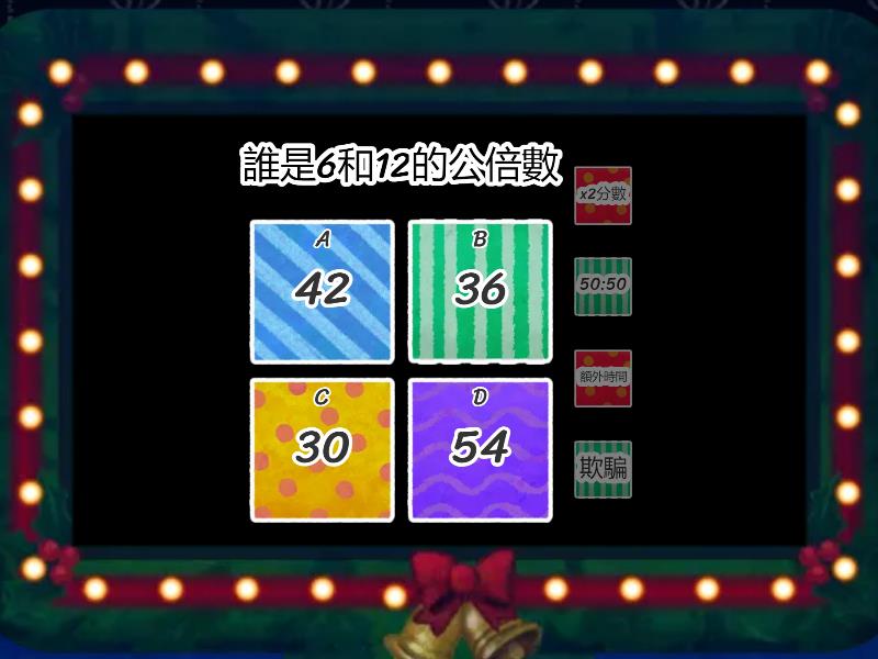 1) 誰不是16的因數? a) 4 b) 8 c) 16 d) 6 2) 誰是15的倍數 a) 75 b) 65 c) 50 d) 84 3) 誰不是120的因數 a) 60 b) 80 c) 15 d) 12 4) 誰不是50的因數? a) 5 b) 25 c) 20 d) 10 5) 誰不是60的倍數 a) 180 b) 120 c) 80 d) 240 6) 誰是80的因數 a) 25 b) 16 c) 22 d) 15 7) 誰不是150的因數 a) 15 b) 10 c) 35 d) 25 8) 誰是60的因數 a) 25 b) 16 c) 8 d) 20 9) 誰是55的因數 a) 11 b) 22 c) 6 d) 10 10) 誰不是56的因數 a) 4 b) 7 c) 8 d) 10 11) 誰是12和16的公因數 a) 8 b) 6 c) 4 d) 3 12) 誰是6和12的公倍數 a) 42 b) 36 c) 30 d) 54 13) 誰是10和12的最小公倍數 a) 30 b) 40 c) 50 d) 60 14) 50和25的最大公因數是誰 a) 5 b) 50 c) 25 d) 1 15) 下列何者互質 a) 4,5 b) 2,8 c) 6,8 d) 14,7