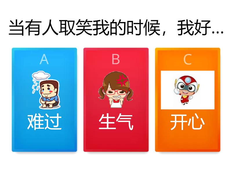1) 当有人取笑我的时候,我好... a) 难过 b) 生气 c) 开心 2) 当我尽了最大的努力,还是不能把图画画好/手工做好,我好... a) 愤怒 b) 生气 c) 难过 3) 老师说我在上课时讲话,但我并没有说话,被老师冤枉,我好... a) 伤心 b) 开心 c) 生气 4) 每天都有一大堆的功课,我好... a) 生气 b) 开心 c) 害怕 5) 读了那么久,听写总是读不会,我好... a) 难过 b) 生气 c) 担心 6) 你生气的时候通常会想怎么样? a) ? b) ?? 7) 你通常会做些什么让自己消气? a) ? b) ??
