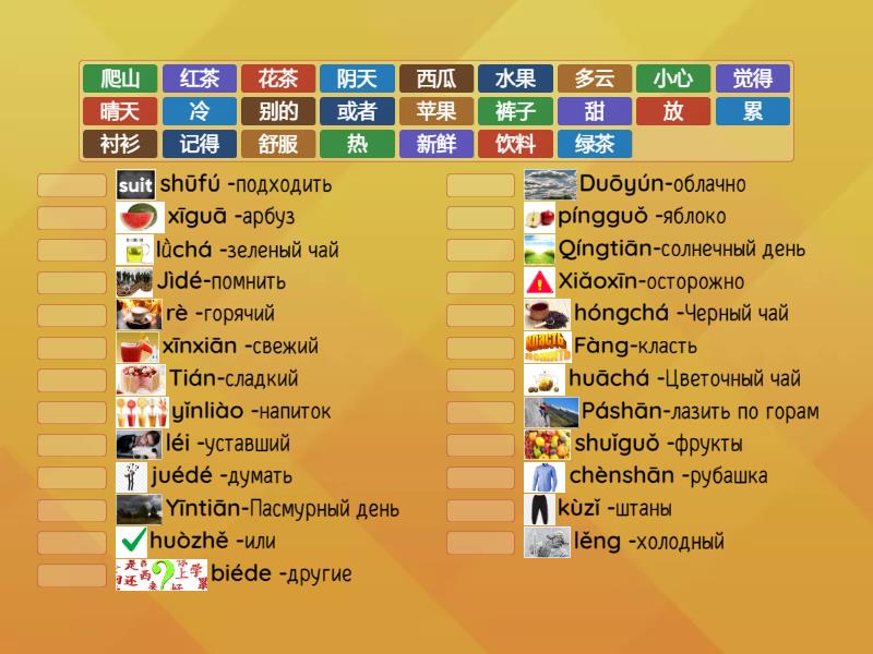 晴天 - Qíngtiān-солнечный день, 阴天 - Yīntiān-Пасмурный день, 多云 - Duōyún-облачно, 爬山 - Páshān-лазить по горам, 小心 - Xiǎoxīn-осторожно, 裤子 - kùzǐ -штаны, 别的 - biéde -другие, 衬衫 - chènshān -рубашка, 觉得 - juédé -думать, 记得 - Jìdé-помнить, 水果 - shuǐguǒ -фрукты, 新鲜 - xīnxiān -свежий, 西瓜 - xīguā -арбуз, 苹果 - píngguǒ -яблоко, 甜 - Tián-сладкий, 红茶 - hóngchá -Черный чай, 绿茶 - lǜchá -зеленый чай, 花茶 - huāchá -Цветочный чай, 舒服 - shūfú -подходить, 热 - rè -горячий, 累 - léi -уставший, 或者 - huòzhě -или, 冷 - lěng -холодный, 饮料 - yǐnliào -напиток, 放 - Fàng-класть,