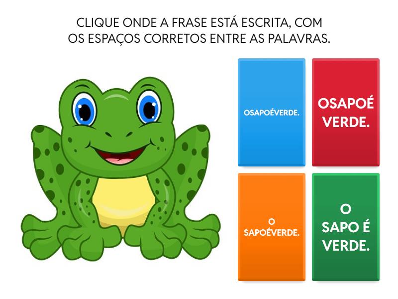 1) CLIQUE ONDE A FRASE ESTÁ ESCRITA, COM OS ESPAÇOS CORRETOS ENTRE AS PALAVRAS. a) OSAPOÉVERDE. b) OSAPOÉ VERDE. c) O SAPOÉVERDE. d) O SAPO É VERDE. 2) Clique onde uma frase está escrita corretamente. a) A BRUXAÉPEQUENA. b) ABRUXA ÉPEQUENA c) A BRUXA É PEQUENA. d) ABRUXAÉ PEQUENA. 3) Clique onde uma frase está escrita corretamente. a) ABOLA ÉCOLORIDA. b) ABOLAÉCOLORIDA. c) A BOLA É COLORIDA. d) ABOLAÉ COLORIDA. 4) Clique onde uma frase está escrita corretamente. a) OSOLÉAMARELO. b) O SOL ÉAMARELO. c) O SOL É AMARELO. d) OSOL É AMARELO. 5) Clique onde uma frase está escrita corretamente. a) AMENINAESTÁCOMENDO. b) A MENINA ESTÁ COMENDO. c) A MENINAESTÁ COMENDO. d) AMENINA ESTÁCOMENDO.
