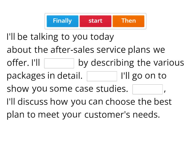 I'll be talking to you today about the after-sales service plans we offer. I'll ____ by describing the various packages in detail. ____ I'll go on to show you some case studies. ____, I'll discuss how you can choose the best plan to meet your customer's needs. I've ____ my talk into three main parts. First of ____, I'll tell you something about the history of our company. ____ that I'll describe how the company is structured and finally, I'll give you some details about our range of products and services. I'd like to update you on what we've been working on over the last year. I'll focus on three main ____: first, our joint venture in Asia; second, the new plant in Charleston. And ____ our redevelopment project.