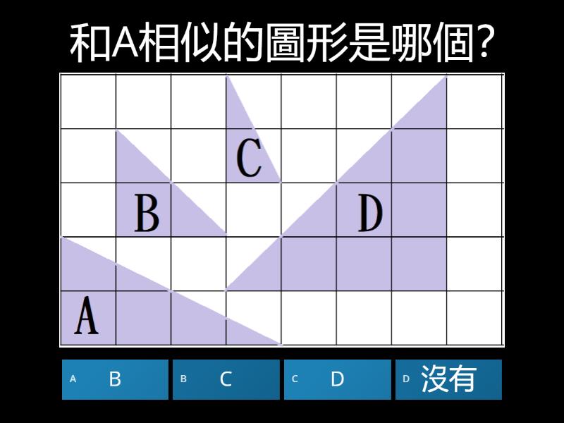 1) 和A相似的圖形是哪個? a) B b) C c) D d) E 2) 和B相似的圖形是哪個? a) A b) C c) D d) E 3) 和D相似的圖形是哪個? a) A b) C c) E d) F 4) 乙圖是甲圖的幾倍放大圖? a) 2 b) 0.5 c) 4 5) 甲圖是乙圖的幾倍縮圖? a) 2 b) 0.5 c) 4 6) 乙圖面積是甲圖的幾倍 a) 2 b) 0.5 c) 4 7) 甲圖的點B和乙圖哪個點對應? a) D b) E c) F 8) 甲圖的∠A和乙圖哪個角對應? a) ∠D b) ∠E c) ∠F 9) 和A相似的圖形是哪個? a) B b) C c) D d) 沒有 10) 和B相似的圖形是哪個? a) A b) C c) D d) 沒有
