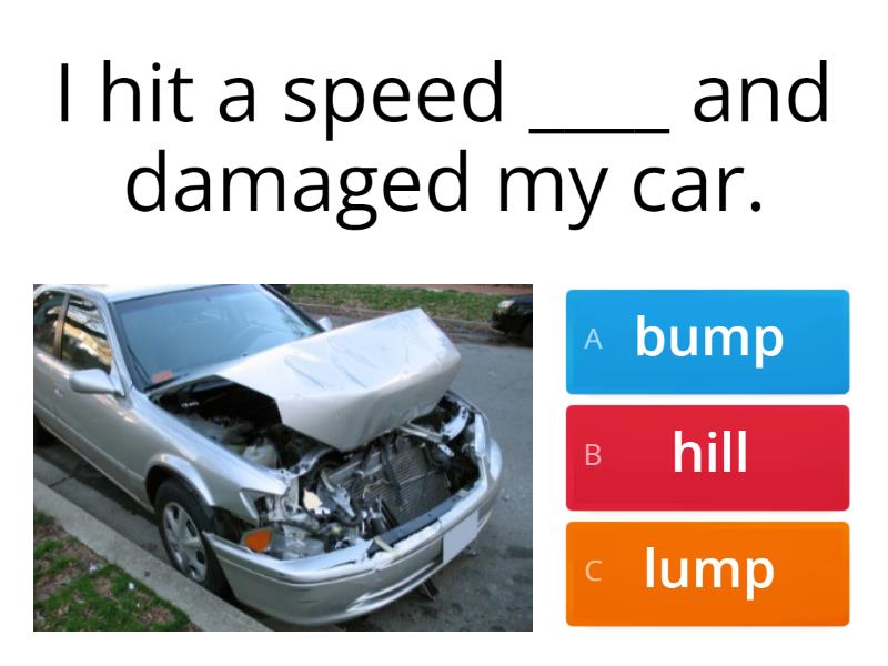 1) I hit a speed ____ and damaged my car. a) bump b) hill c) lump 2) They agree to pay the cost of all a) structure b) construction c) repairs 3) Thanks for coming. I really _____ it. a) cost b) worth c) appriciate 4) My wallet was ____ . a) stealed b) stolen c) stole 5) He brightened ___ at their words of encouragement. a) up b) out c) in 6) It's ____ to drive through a red light. a) unlegal b) non-legal c) illegal 7) The police arrived at the crime ____ in a minute. a) place b) scene c) sight 8) They arrested a _____ of pickpockets. a) team b) band c) gang 9) Police have so far failed to ___ the missing woman. a) trace b) hunt c) track 10) The burglar was sentenced ____ four years in prison. a) for b) in c) to