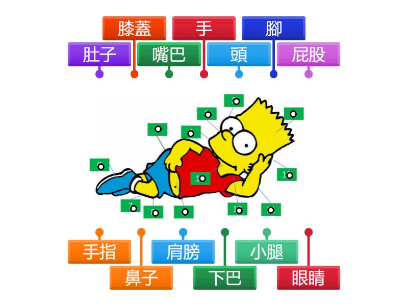 頭, 眼睛, 鼻子, 嘴巴, 屁股, 腳, 小腿, 膝蓋, 肚子, 肩膀, 手, 手指, 下巴.