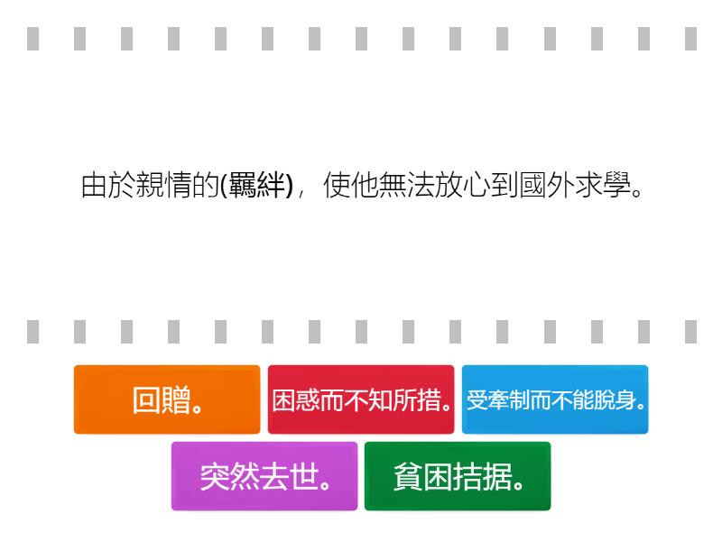 受牽制而不能脫身。 - 由於親情的(羈絆),使他無法放心到國外求學。, 困惑而不知所措。 - 面對這突發狀況,他感到相當(迷惘),不知該做些什麼。, 回贈。 - 他捐了一筆錢,(回饋)母校的教育之恩。, 貧困拮据。 - 他的家庭環境雖然(窘困),卻絲毫挫折不了他的志氣。, 突然去世。 - 小時候,小明媽媽(驟逝),所以他被叔叔撫養長大。,