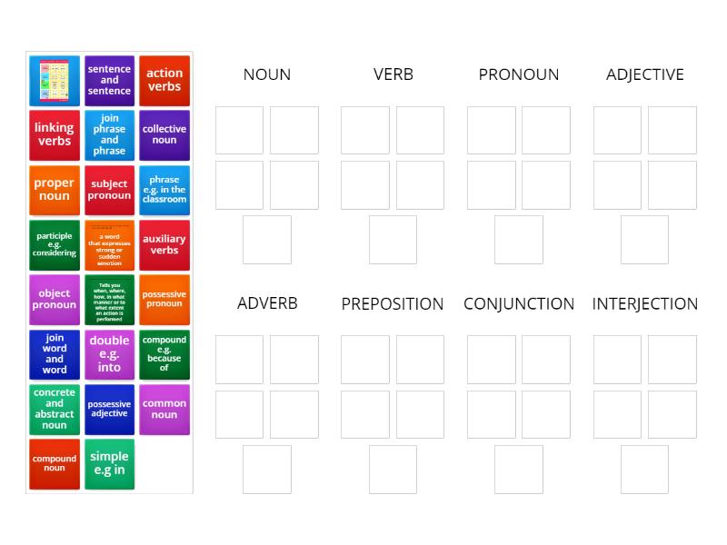NOUN: common noun, proper noun, collective noun, compound noun, concrete and abstract noun, VERB: linking verbs, action verbs, auxiliary verbs, PRONOUN: subject pronoun, object pronoun, possessive pronoun, possessive adjective, ADJECTIVE: , ADVERB: Tells you when, where, how, in what manner or to what extent an action is performed, PREPOSITION: simple e.g in, double e.g. into, phrase e.g. in the classroom, compound e.g. because of, participle e.g. considering, CONJUNCTION: join word and word, join phrase and phrase, sentence and sentence, INTERJECTION: a word that expresses strong or sudden emotion,