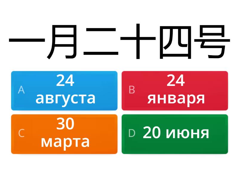 1) 一月二十四号 a) 24 августа b) 24 января c) 30 марта d) 20 июня 2) 二月十四号 a) 24 августа b) 18 апреля c) 4 марта d) 14 февраля 3) 三月四号 a) 4 марта b) 18 ноября c) 17 августа d) 14 февраля 4) 四月十八号 a) 5 мая b) 24 января c) 14 февраля d) 18 апреля 5) 五月五号 a) 24 августа b) 4 сентября c) 5 мая d) 3 июля 6) 六月二十号 a) 18 ноября b) 20 июня c) 20 декабря d) 4 сентября 7) 七月二十号 a) 18 ноября b) 3 июля c) 20 июня d) 20 июля 8) 八月二十四号 a) 4 марта b) 24 августа c) 3 ноября d) 18 ноября 9) 九月四号 a) 18 ноября b) 20 июня c) 3 ноября d) 4 сентября 10) 十月五号 a) 24 августа b) 5 октября c) 14 февраля d) 24 января 11) 十一月十八号 a) 24 августа b) 3 ноября c) 4 сентября d) 18 ноября 12) 十二月二十号 a) 24 августа b) 20 декабря c) 18 апреля d) 5 октября 13) 八月十七号 a) 24 января b) 18 ноября c) 17 августа d) 5 мая 14) 七月三号 a) 3 июля b) 17 августа c) 5 октября d) 18 апреля 15) 十一月三号 a) 3 ноября b) 18 апреля c) 24 августа d) 3 июля 16) 三月三十号 a) 17 августа b) 20 декабря c) 30 марта d) 18 ноября