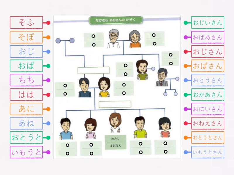 そふ, おじいさん, そぼ, おばあさん, おじ, おじさん, おば, おばさん, ちち, おとうさん, はは, おかあさん, あに, おにいさん, あね, おねえさん, おとうと, おとうとさん, いもうと, いもうとさん.