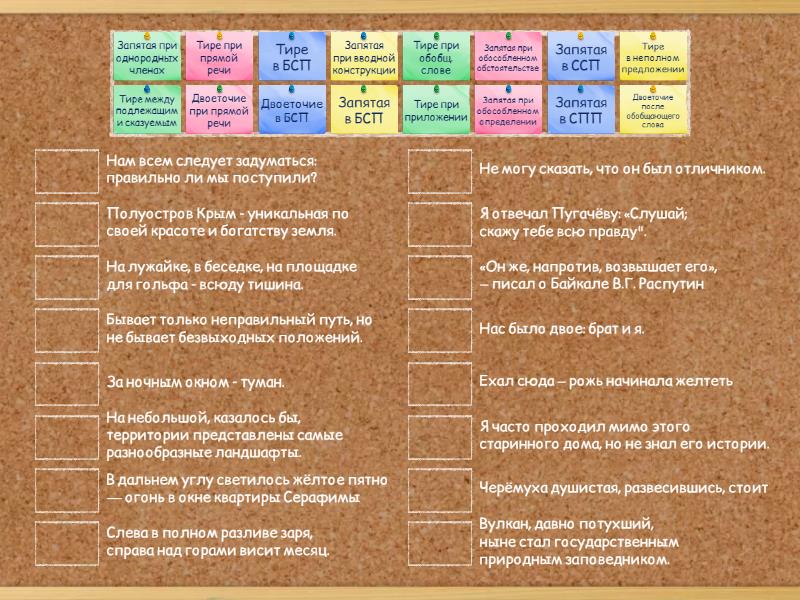 Тире между подлежащим и сказуемым - Полуостров Крым - уникальная по своей красоте и богатству земля., Тире при обобщ. слове - На лужайке, в беседке, на площадке для гольфа - всюду тишина., Тире в неполном предложении - За ночным окном - туман., Тире в БСП - Ехал сюда – рожь начинала желтеть, Тире при приложении - В дальнем углу светилось жёлтое пятно — огонь в окне квартиры Серафимы, Тире при прямой речи - «Он же, напротив, возвышает его», – писал о Байкале В.Г. Распутин, Запятая при обособленном определении - Вулкан, давно потухший, ныне стал государственным природным заповедником., Запятая при обособленном обстоятельстве - Черёмуха душистая, развесившись, стоит, Запятая в ССП - Бывает только неправильный путь, но не бывает безвыходных положений., Запятая в СПП - Не могу сказать, что он был отличником., Запятая в БСП - Слева в полном разливе заря, справа над горами висит месяц., Запятая при однородных членах - Я часто проходил мимо этого старинного дома, но не знал его истории., Двоеточие в БСП - Нам всем следует задуматься: правильно ли мы поступили?, Двоеточие при прямой речи - Я отвечал Пугачёву: «Слушай; скажу тебе всю правду"., Двоеточие после обобщающего слова - Нас было двое: брат и я., Запятая при вводной конструкции - На небольшой, казалось бы, территории представлены самые разнообразные ландшафты.,