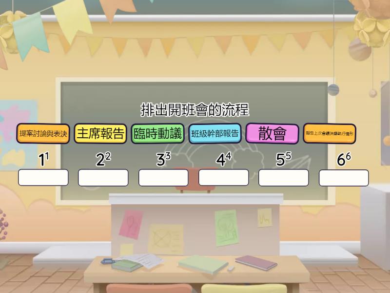 主席報告, 報告上次會議決議執行情形, 班級幹部報告, 提案討論與表決, 臨時動議, 散會.