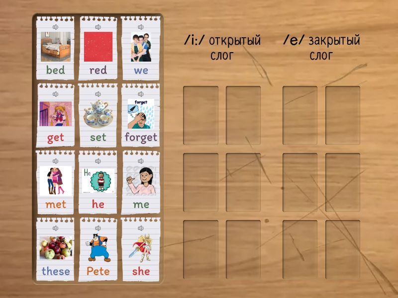 /i:/ открытый слог: Pete, he, she, we, these, me, /e/ закрытый слог: bed, get, red, set, forget, met,