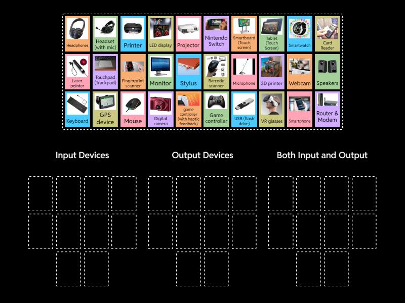 Input Devices: Mouse , Keyboard, Barcode scanner, Microphone, Game controller, Webcam, Stylus , Touchpad (Trackpad), Card Reader, Fingerprint scanner, Output Devices: Printer , Monitor, Speakers, Projector, Headphones, GPS device, Laser pointer, VR glasses, LED display, 3D printer, Both Input and Output: Tablet (Touch Screen), Smartboard (Touch screen), Headset (with mic), USB (flash drive), Router & Modem, Smartphone, Digital camera, Nintendo Switch, Smartwatch, game controller (with haptic feedback),
