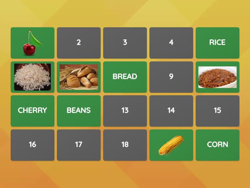 CHERRY, CORN, RICE, BEANS, BREAD, CARROT, BARBECUE, ICE CREAM, LETTUCE, COFFEE,