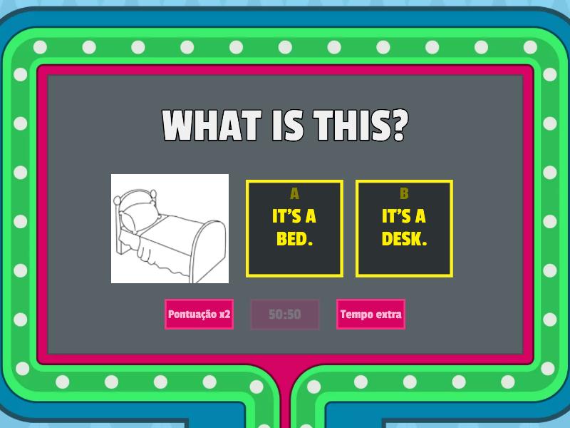 1) WHAT IS THIS? a) IT'S A BED. b) IT'S A DESK. 2) WHAT IS THIS? a) IT'S A COMPUTER. b) IT'S A DOOR. 3) WHAT IS THIS?  a) IT'S A CHAIR. b) IT'S A LAMP. 4) WHAT IS THIS? a) IT'S A WARDROBE. b) IT'S A WINDOW. 5) WHAT IS THIS? a) IT'S A BED. b) IT'S A LAMP. 6) WHAT IS THIS? a) IT'S A WARDROBE. b) IT'S A CHAIR. 7) WHAT IS THIS? a) IT'S A DOOR. b) IT'S A DESK. 8) WHAT IS THIS? a) IT'S A COMPUTER. b) IT'S A WINDOW. 9) WHAT IS THIS? a) IT IS A PILLOW b) IT IS A DOOR 10) WHAT IS THIS? a) THIS IS A BOOKCASE b) THIS IS A BED