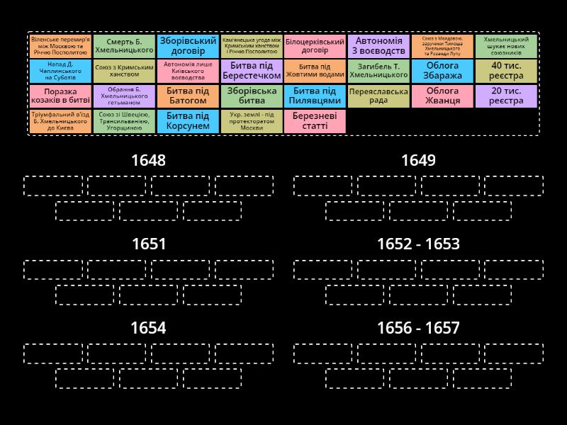 1648: Обрання Б. Хмельницького гетьманом, Битва під Жовтими водами, Напад Д. Чаплинського на Суботів, Битва під Пилявцями, Битва під Корсунем, Тріумфальний в'їзд Б. Хмельницького до Києва, Союз з Кримським ханством, 1649: Зборівська битва, Зборівський договір, Автономія 3 воєводств, 40 тис. реєстра, Облога Збаража, 1651: Битва під Берестечком, Поразка козаків в битві, Білоцерківський договір, Автономія лише Київського воєводства, 20 тис. реєстра, 1652 - 1653 : Битва під Батогом, Союз з Молдовою, заручини Тимоша Хмельницького та Розанди Лупу, Загибель Т. Хмельницького, Облога Жванця, Кам'янецька угода між Кримським ханством і Річчю Посполитою, 1654: Переяславська рада, Березневі статті, Укр. землі - під протекторатом Москви, 1656 - 1657: Віленське перемир'я між Москвою та Річчю Посполитою, Хмельницький шукає нових союзників, Союз зі Швецією, Трансильванією, Угорщиною, Смерть Б. Хмельницького,